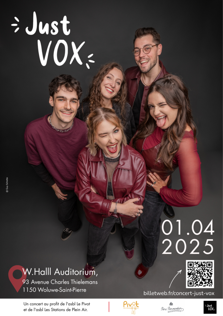 Avec Just Vox, la magie opère dès la première note. Laissez-vous emporter par cette performance unique proposée par un groupe Acapella ! Un concert exceptionnel, donné en exclusivité au profit de l’ASBL Le Pivot, en collaboration avec l’ASBL Les Stations de Plein Air