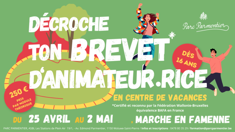 Séjour d’une semaine (en résidentiel), du samedi au samedi, pour la partie théorique 1 suivi d’un stage pratique de 2 semaines niveau 1 (non résidentiel dans le centre de vacances de votre choix reconnu par l’ONE. Evidemment, nous prenons volontiers les stagiaires)